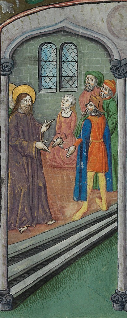 Early in the morning he [Jesus] came again to the temple. All the people came to him and he sat down and began to teach them. The scribes and the Pharisees brought a woman who had been caught in adultery; and making her stand before all of them, they said to him, “Teacher, this woman was caught in the very act of committing adultery. Now in the law Moses commanded us to stone such women. Now what do you say?” They said this to test him, so that they might have some charge to bring against him (John 8:2-6a).